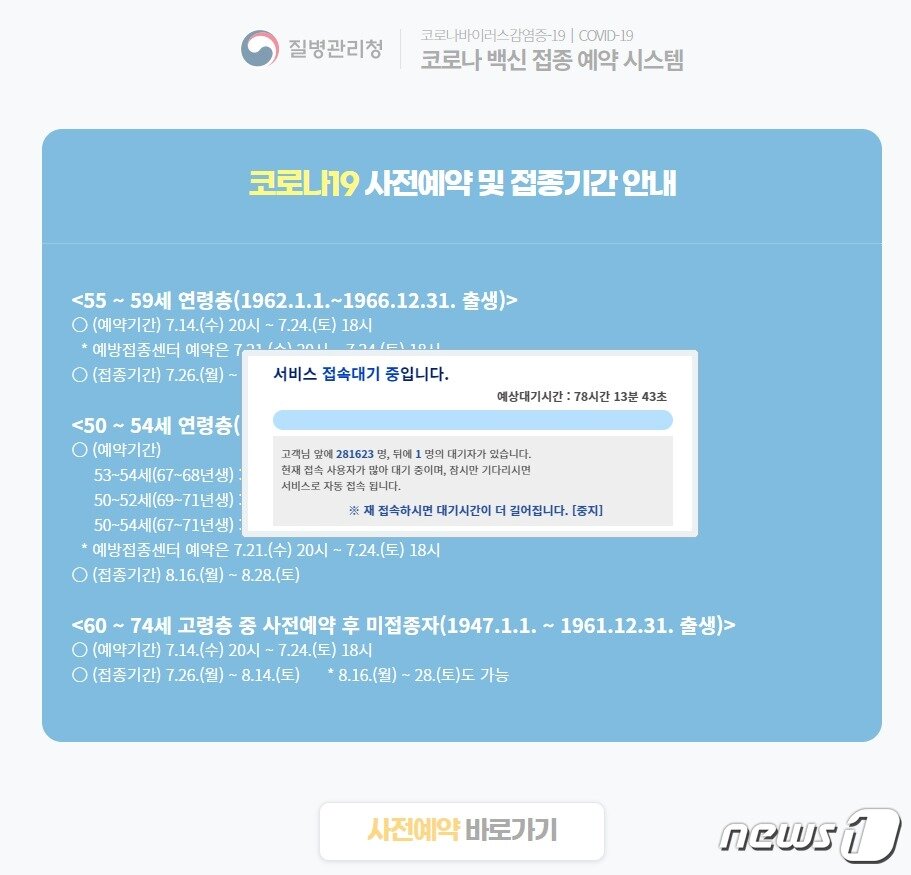 백신예약 우회 : Wktwwrosfwcefm / 지난 14일 55~59세 대상 사전예약 때도 예약 개시 전 페이지에 곧바로 연결되는 접속 주소(직접링크)가 공개돼 논란이 일었다.